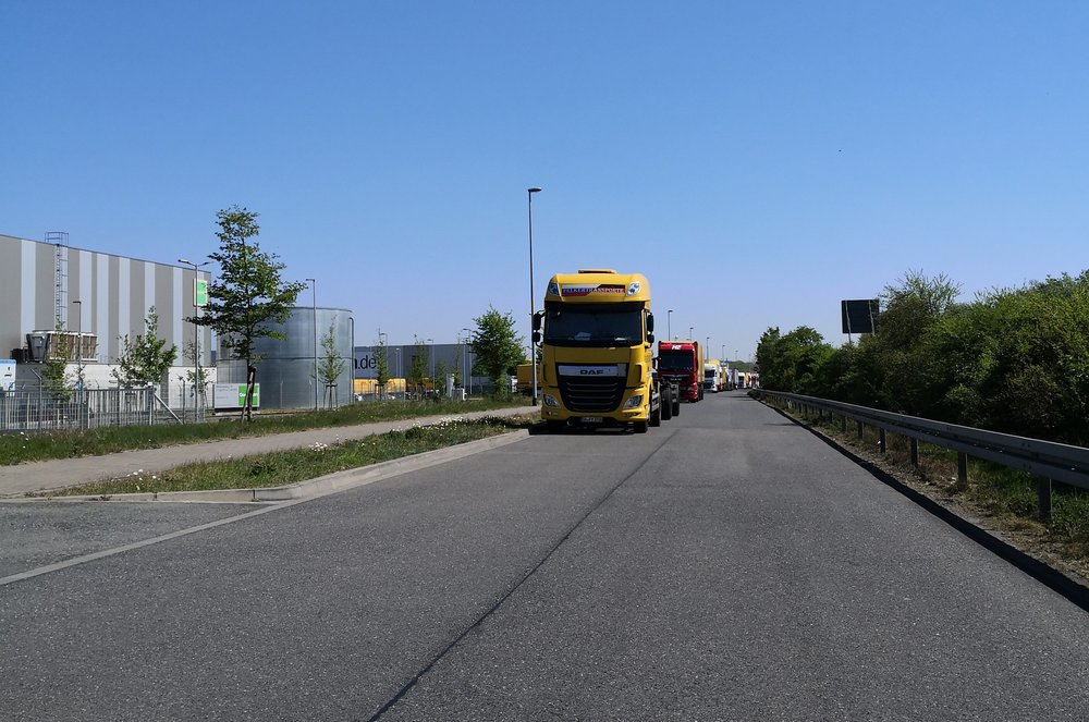 Ralf Winstroth, Sachkundiger Bürger der Grünen Fraktion, hat beobachtet: „An einem Nachmittag um 15h standen dort 25 Sattelzüge bzw. auch nur Zugmaschinen auf der Straße Minkeldonk. Erkennbar waren etliche Fahrzeuge für längere Parkzeiten vorbereitet, wohl auch Übernachtungen. Gegen Abend standen immer noch 18 Fahrzeuge dort, an vielen Fahrzeugen wurde outdoor von den Fahrern gekocht. Entlang des Zauns sind zwei Dixi-Klos und am Anfang der Zufahrt von der Alte Landstraße ist eine 1100 l Mülltonne aufgestellt. Im Graben entlang der Böschung zur L 510 liegt sehr viel Müll.