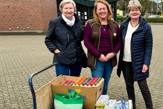 Bei der Rheinberger Tafel werden aktuell Hygieneartikel benötigt. So haben die Mitglieder des Rheinberger Ortsverbandes der Grünen bei ihren Versammlungen einige Barmittel in der Spardose für den Kauf solcher Produkte zur Verfügung gestellt. Barbara Ettwig und Dagmar Krause-Bartsch übergaben diese am Dienstag Frau Braun und ihrem Team neben den schön gefärbten Ostereiern für die Kunden der Tafel. Der Ortsverband Bündnis90/Die Grünen wünscht allen ehenamtlichen Helfern und Helferinnen der Tafel sowie den Kunden Frohe Ostern!