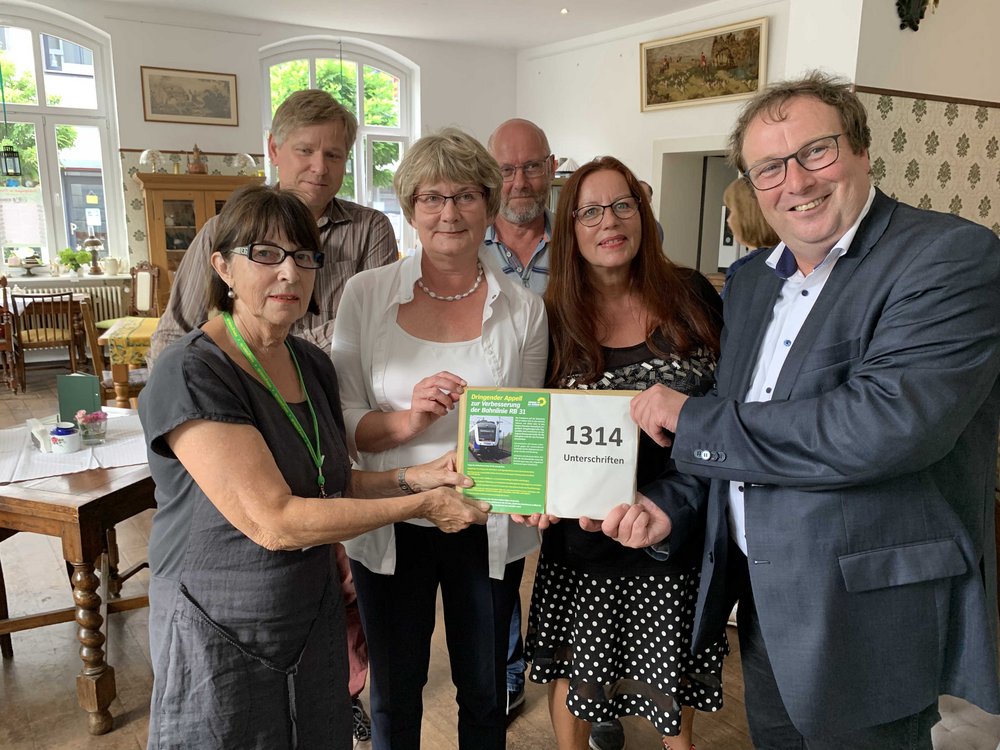 Womit wir mitten im Thema wären. Denn die Grünen hatten Krischer eingeladen, um ihm 1314 Unterschriften zu überreichen, die sie in den vergangenen Monaten zur desolaten Situation der Regionalbahn 31 gesammelt hatten. Zu wenig Lokführer auf der Strecke, häufige Betriebsstörungen, nur eine doppelgleisige Stelle, auf der sich entgegenkommende Züge ausweichen könne, sieben unbeschrankte Bahnübergänge und kein Stellwerk zwischen Millingen und Xanten – das seien die Hauptgründe dafür, dass es auf der Strecke immer wieder zu Problemen komme, erläuterte der verkehrspolitische Sprecher der Grünen-Kreistagsfraktion, Lukas Aster aus Sonsbeck. „An der Strecke leben 260.000 Menschen. Es ist eine Unverfrorenheit, wie die Deutsche Bahn uns abspeist und nicht einmal die kleinsten Zugeständnisse macht.“ Deshalb seien die Betroffenen am Niederrhein dringend auf die Hilfe von Bund und Land angewiesen. Asters Fazit: „Wir sind weit weg von der Verkehrswende.“