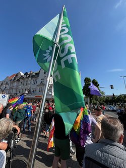Gut 200 Menschen, unter ihnen Mitglieder des Ortsverbandes der GRÜNEN Rheinberg, haben am Pfingstsamstag auf Initiative von „Moers ist bunt, nicht braun“ und „Der Bunte Stammtisch Moers“ am Königlichen Hof mit Plakaten gegen die AfD demonstriert. Diese hatte für den Vormittag eine Kundgebung zur Europawahl am 9. Juni angekündigt. Die beiden Organisatoren der Anti-AfD-Versammlung hatten in ihrem Aufruf betont: „Rassismus, Antisemitismus, Islam- und Queer-Feindlichkeit sowie andere Arten der Diskriminierung sind international auf dem Vormarsch. In Deutschland verschiebt die AfD die Grenzen des Sagbaren und politisch Machbaren immer weiter nach rechts.“ Unter dem Motto „Gesicht zeigen gegen die AfD-Propaganda-Show“ riefen sie zu der Versammlung auf. (Quelle: RP-Online, Bild: privat)