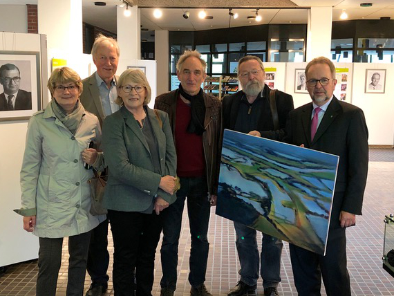 Anlässlich der Abgrabungskonferenz des Regionalverbands Ruhr (RVR) am Dienstag, 8. Oktober 2019, im Weseler Kreishaus übergaben Mitglieder der Rheinberger Grünen Landrat Dr. Ansgar Müller ein Bild des Duisburger Künstlers Franz Schwarz.