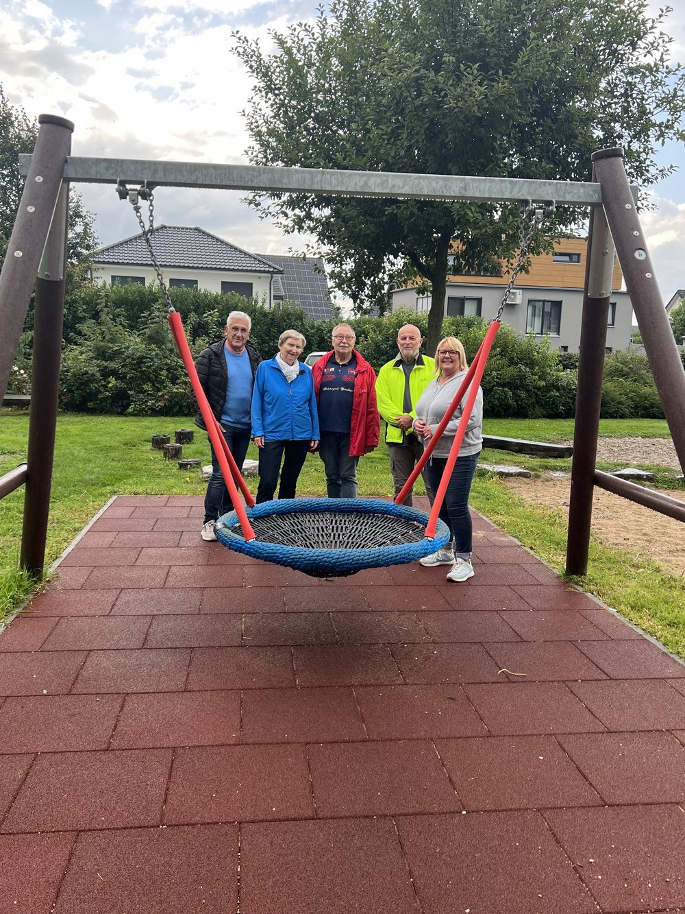 Die GRÜNEN Rheinberg freuen sich, dass eine Nestschaukel auf dem Spielplatz am Pastor-Blanke-Platz in Ossenberg in diesem Sommer installiert wurde. Nun können auch gehandicapte Kinder mit Freude am Spielen aller Kinder teilnehmen. Vertreter*innen der Partei, Barbara Ettwig, Jeannette Fritz, Peter Mokros und Dagmar Krause-Bartsch nahmen mit Vertretern des Heimatvereins Herrlichkeit, Carl Caniels und Hans Dröttboom, das neue Spielgerät in Augenschein (Foto: Dagmar Krause-Bartsch).